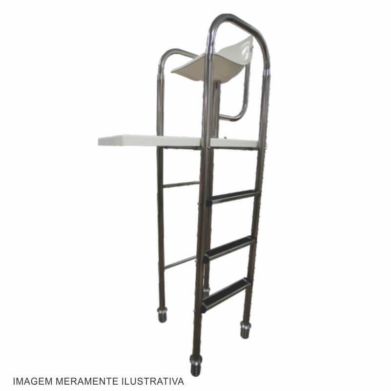 A Cadeira Salva-Vidas da ALBACETE foi projetada para atender plenamente a NBR11238, proporcionando ao guardador segurança, conforto e ampla-visão na sua atuação. Fabricada em aço inox 304 com cadeira confeccionada em fibra de vidro que pode girar até um ângulo de 60graus. Possui degraus e prancha antiderrapantes, além de suporte traseiro para guarda-sol.