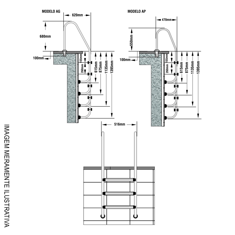 A Escada Arco Grande AG é um item imprescindível em qualquer piscina, pois ela possibilita e facilita a entrada e a saída do usuário do tanque. As escadas para piscina ALBACETE são produzidas em duas versões: AP (Arco Pequeno) e AG (Arco Grande), sendo projetadas para instalação em todos os tipos de piscina: concreto, fibra de vidro e vinil. As escadas de piscina ALBACETE possuem corrimão em aço inox com degraus constituídos de haste de metal, oferecendo: segurança, resistência e durabilidade ao produto.