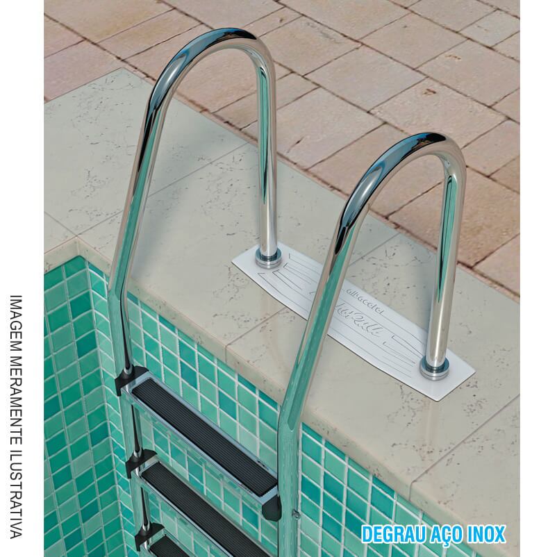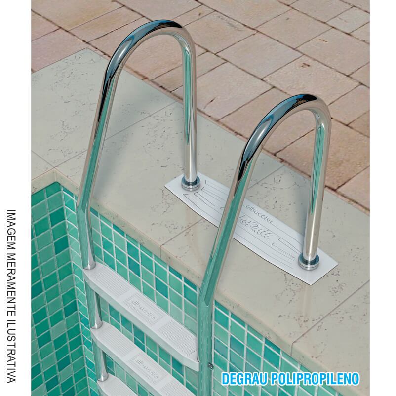 A Escada Arco Pequeno AP é um item imprescindível em qualquer piscina, pois ela possibilita e facilita a entrada e a saída do usuário do tanque. As escadas para piscina ALBACETE são produzidas em duas versões: AP (Arco Pequeno) e AG (Arco Grande), sendo projetadas para instalação em todos os tipos de piscina: concreto, fibra de vidro e vinil. As escadas de piscina ALBACETE possuem corrimão em aço inox com degraus constituídos de haste de metal, oferecendo: segurança, resistência e durabilidade ao produto.